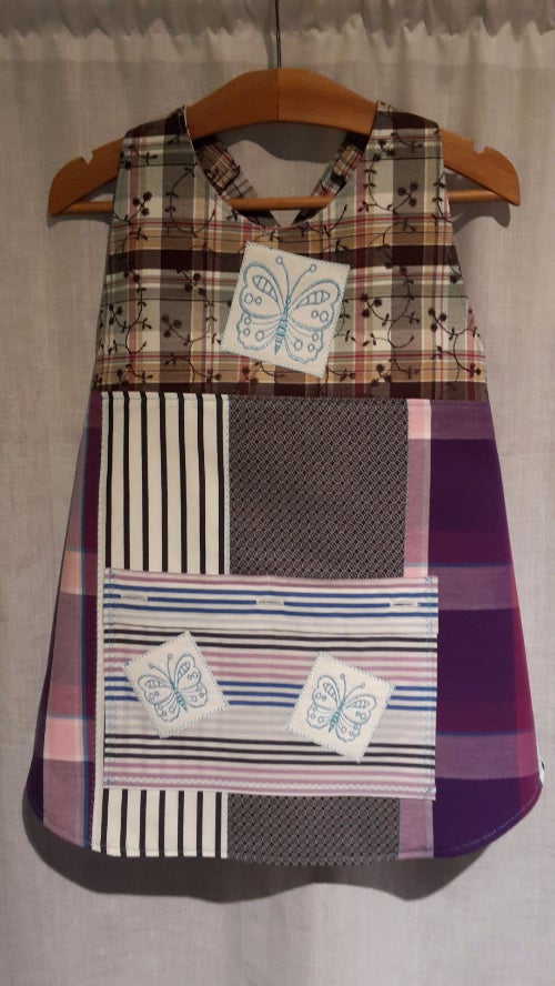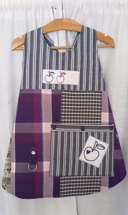 Traditioneel schortje met strikbanden. Het is volledig gemaakt van gerecyclede materialen. Met zakje op het voorpand en geborduurde afbeeldingen. Geschikt voor kinderen tot circa 4 jaar.